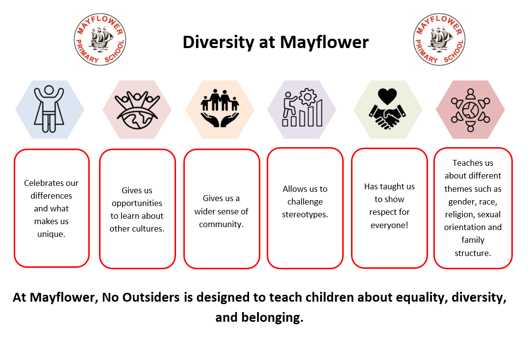 At Mayflower, we use the No Outsiders programme, developed by Andrew Moffat, to teach all children about equality and diversity. Using picture books and classroom discussions, we aim to foster belonging, challenge stereotypes, and promote respect for differences in race, religion, gender, and family structures. We want to teach the children that everyone is welcome within our community, ensuring no one feels like an 'outsider'.