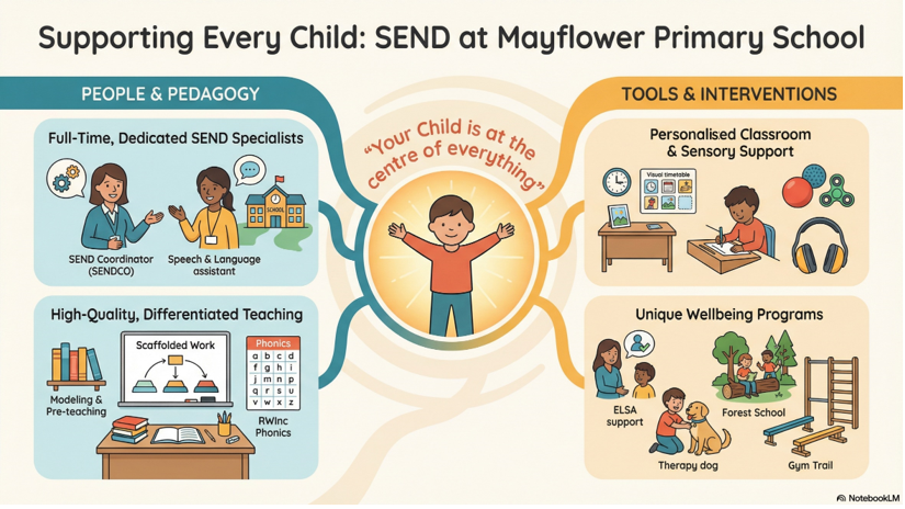 At Mayflower we aim to support all children and their individual needs. SEND at Mayflower Primary School comes in a variety of different forms. Each pupil is unique and therefore needs to be reviewed as an individual, not a diagnosis or difficulty. As a school we ensure high quality teaching is at the heart of any classroom. We believe that every child has the ability to succeed and as teachers and support staff we are there to facilitate and provide the resources to enable this to happen.