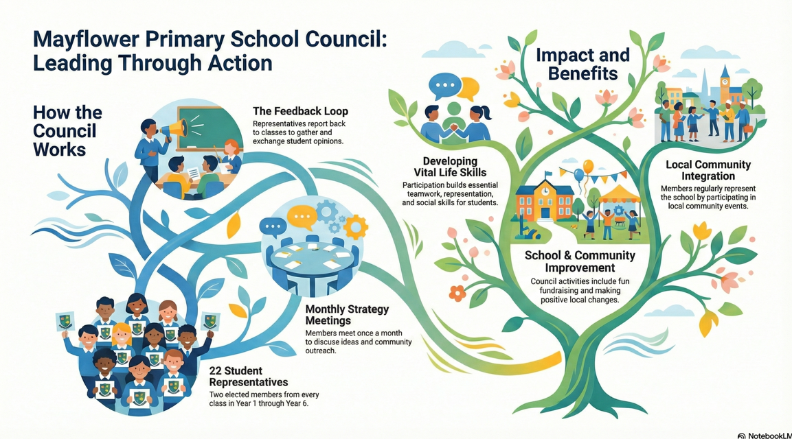 The School Council has 22 members. There are two members from each class in the school from Year 1 to Year 6. These children have been chosen by their classes to represent them at School Council meetings throughout the year. The School Council meets once a month to discuss a range of ideas or to get out into the community. After each meeting, School Council members report back to their classes giving all children a chance to add their ideas and opinions. These are then fed back to the School Council in the next meeting.