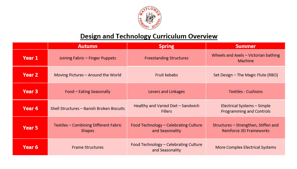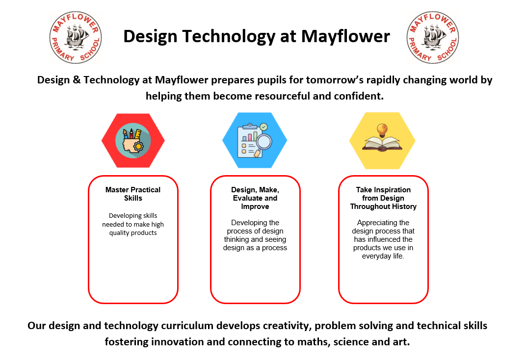 Design & Technology at Mayflower helps to prepare pupils to participate in tomorrow's rapidly changing technologies. Children are helped to develop the skills that enable them to plan, design, make and evaluate products and systems. Design & Technology also includes cooking and nutrition, where pupils are taught how to cook and apply the principles of nutrition and healthy eating.