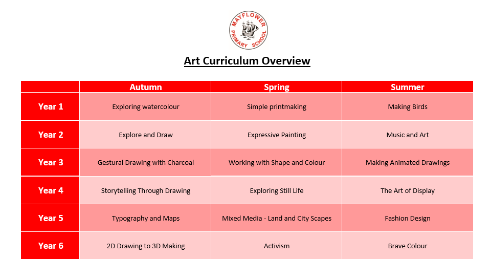 At Mayflower, we encourage children to develop their creative and imaginative talents by teaching skills and techniques using a variety of materials and tools. Pupils are taught to build their creative independence and are encouraged to experiment with colour, texture and techniques in their sketchbooks before creating a final product. Pupils have opportunities to work with professional artists and craftspeople. They are encouraged to evaluate their own work and learn to appreciate the work of others, using artistic language to describe paintings, sculptures and other artefacts.