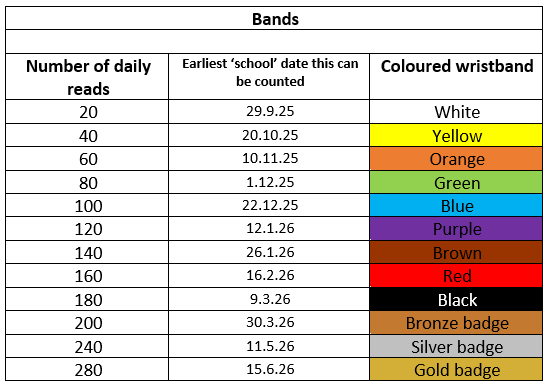 At the end of the academic year, your child will be able to keep any black wristband, or bronze/silver/gold badge that they have earned. There is no cost for this new reading incentive scheme, but we may ask for a small donation should any bands get lost or broken.